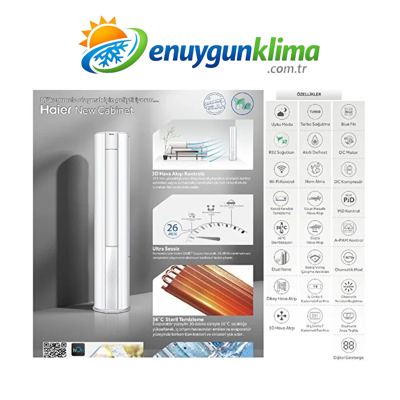 Haier Salon Tipi Cabinet 24000 BTU, orta ve büyük ölçekli alanlar için geliştirilmiş güçlü performanslı bir salon tipi klima modelidir.